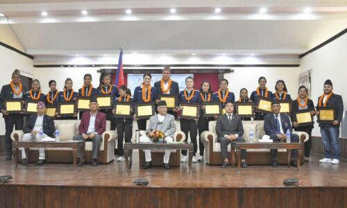 KATHMANDU, AUGUST 29: Prime Minister KP Sharma Oli has awarded national women volleyball players, coaches and manager participating in the CAVA Women’s Volleyball National League. At a programme organized at the official residence of the Prime Minister at Baluwatar, today, PM Oli distributed prizes to 14 players of the National Women Volleyball Team including captain...